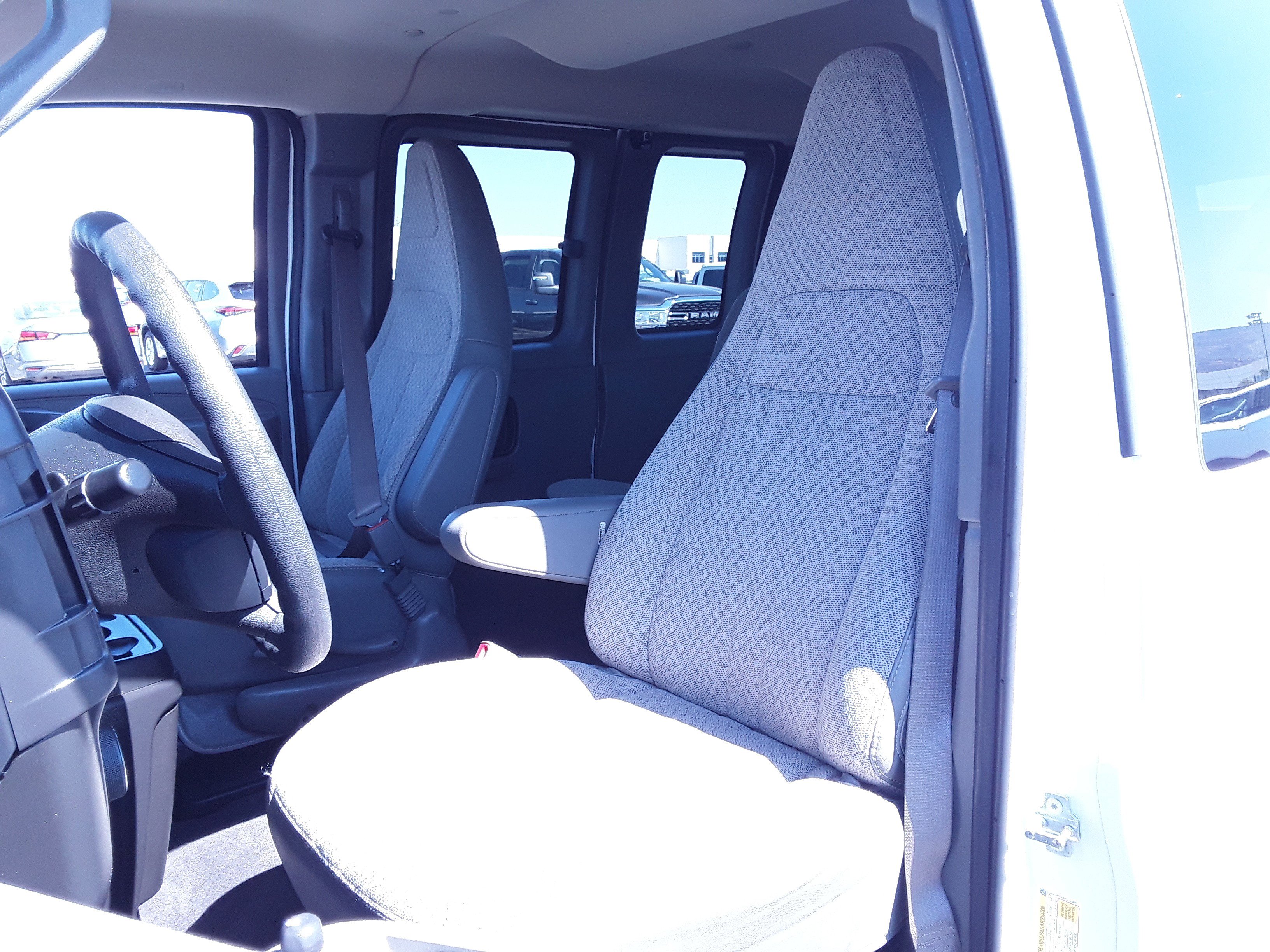 • Seats, front bucket with Custom Cloth trim head restraints and inboard armrests (Requires (93G) interior trim. Includes (BA3) console with swing-out storage bin. When ordering a seating arrangement that includes rear seats, includes rear bench seats with Custom Cloth trim. Head restraints are not available on rear bench seats.)