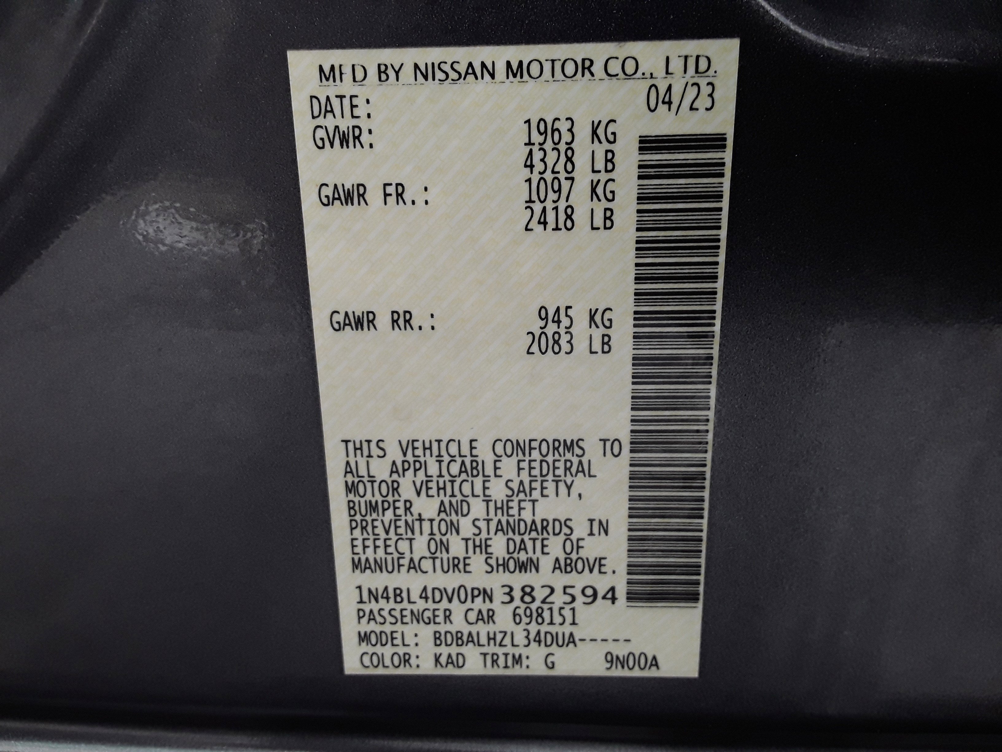 VIN:1N4BL4DV0PN382594